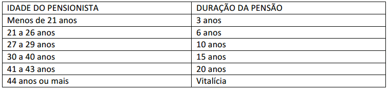 Não. Serão mantidas as regras vigentes. O tempo de duração da pensão por morte e as condições de cessação de cada cota individual são estabelecidos conforme a idade do beneficiário na data de óbito do segurado, na forma da Lei de Benefícios do Regime Geral de Previdência Social. Atualmente, para o cônjuge ou companheiro, a duração da pensão por morte varia de acordo com a idade do pensionista, da seguinte forma: